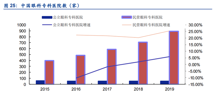 其中,民营眼科专科医院发展迅速,快速从2015年的397家增长至2019年的890家,年化复合增长率达到22.4%。