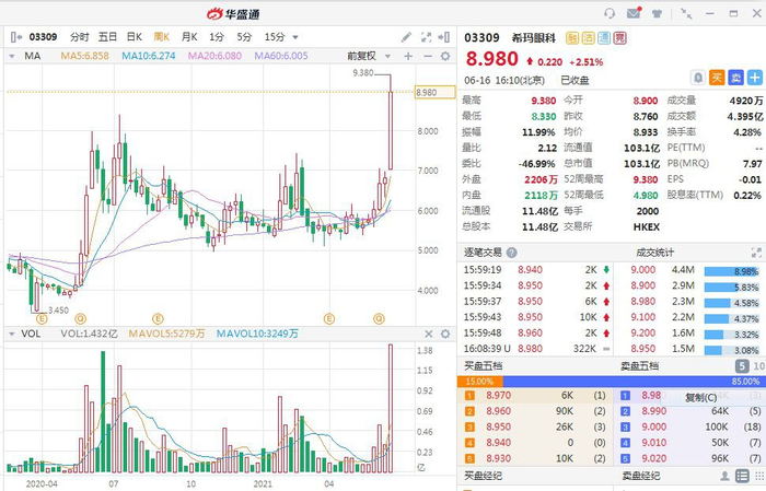 例如近期港股市场上,民营眼科医院股希玛眼科就表现出彩,股价在6月15日一天就暴涨超过28%,在16日盘中希玛眼科继续上涨刷新了近三年股价新高记录。