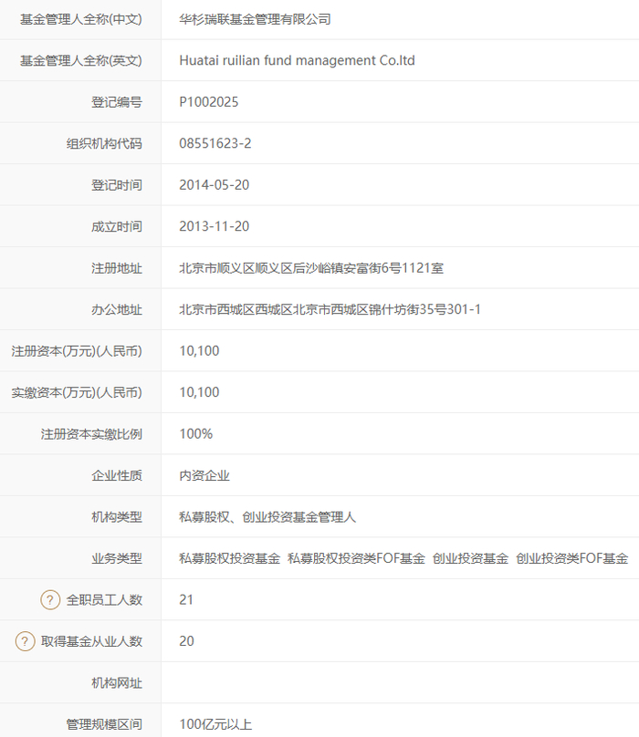 据基金业协会数据,华杉瑞联基金管理有限公司登记备案时间是在2014年5月20日,机构类型是私募股权、创业投资基金管理人,管理规模区间100亿元以上。