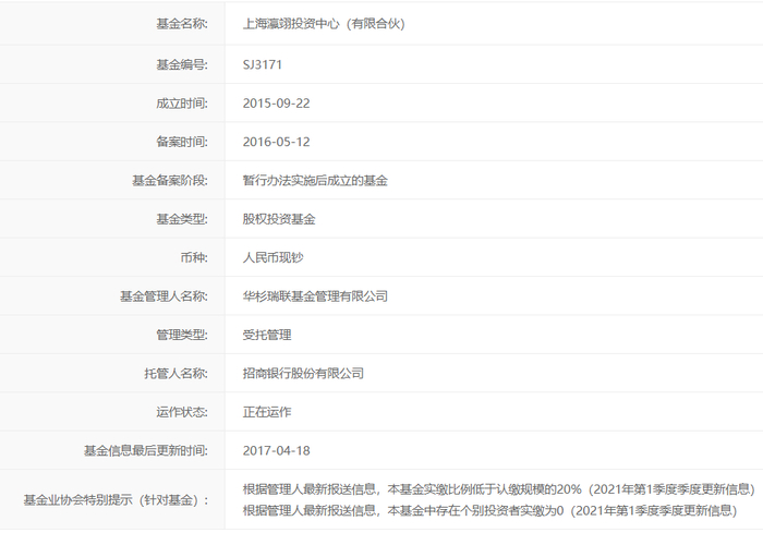 目前上海瀛翊投资中心(有限合伙)的运作状态是“正在运作”,不过协会数据显示,该基金信息最后更新时间是2017年4月18日。诡异的是,《每日经济新闻》记者从基金业协会发布的特别提示(针对基金)发现,“根据管理人最新报送信息,本基金实缴比例低于认缴规模的20%(2021年第1季度更新信息);根据管理人最新报送信息显示,本基金中存在个别投资者实缴为0(2021年第1季度更新信息)。”上述这种情况可以从该基金投资者查询账号开立率为0得到一定程度的佐证。
