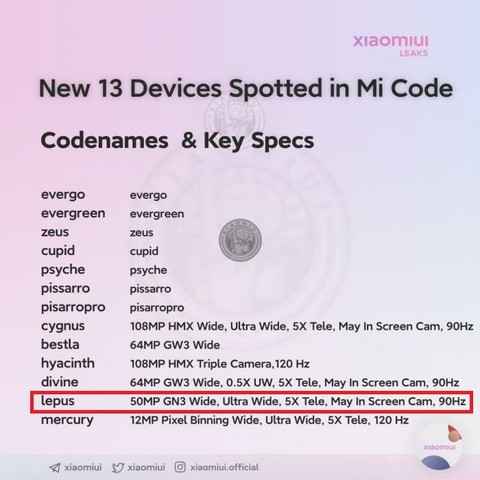 不仅如此,这些小米新机中还有三款采用了屏下前摄技术,内部代号分别为Cygnus,bestla和lepus,所配的显示屏均支持90Hz刷新率,但不排除是初期测试的版本的缘故,或许将来的最终方案会升级为120Hz。其中,代号Cygnus 的新机将拥有108MP主摄和采用了三星HMX传感器,提供了超广镜头和五倍长焦的后置三摄组合。