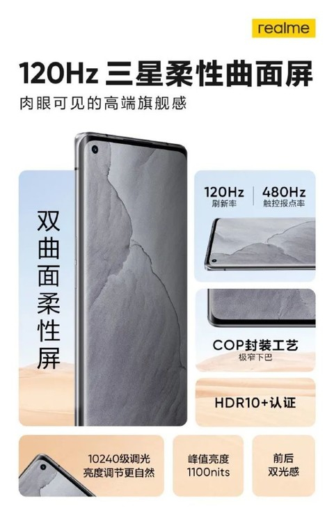 具体的配置方面,GT和GT Neo用的都是三星AMOLED直屏,如果GT大师版再用直屏,估计价格也会与GT Neo一致,提不上去。所以这次换了柔性曲面屏,还是E3三星AMOLED曲面屏。从Realme副总裁徐起曝光的真机照来看,这块柔性屏使用COP封闭工艺,下巴和边框极窄,支持120Hz刷新率和480Hz触控报点率,1100nit峰值亮度,拥有10240级亮度调节。这个数字并没有错,Realme确认就是10240,如果真的如此,那GT大师版的亮度调节要比一加9 Pro、小米11 Ultra还要厉害,同时也能说明这块屏幕确实够出色。
