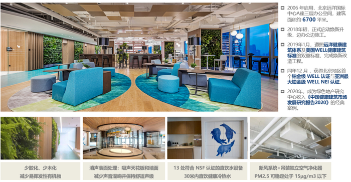 2015年,远洋集团率先将国际WELL标准引入中国。截至2021年6月,远洋已有11个项目正式获得WELL建筑标准最终认证,是中国获得该认证项目个数最多、面积最大的企业;同时,远洋还率先在业内开启体系化打造健康和谐人居环境之路,自主研发的远洋健康建筑体系已升级迭代至1.1版本。截至目前,《远洋健康建筑体系1.1》已经应用在全国44个城市、120余个项目,覆盖面积1,990万平方米。
