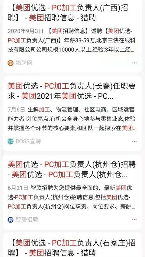 《商业观察家》也从各大招聘平台发现,最早从2020年三季度末开始,美团优选就在招聘生鲜PC加工领域人才,但自2021年二季度来,则呈现出了加快态势。范围从一线城市北京到海量二线城市。