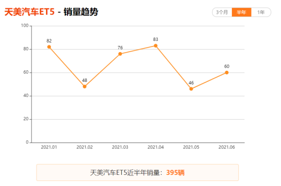 根据乘联会发布的数据来看,近半年天美ET5仅卖出了395台,仅有66辆月均销量的数据可谓是“惨不忍睹”。