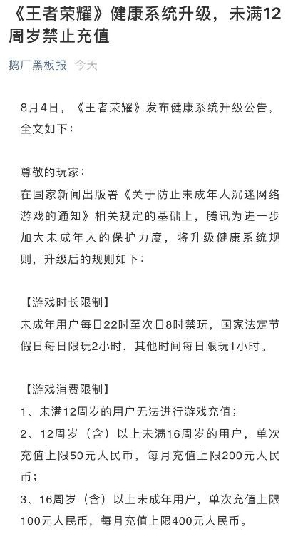 接着8月4日,微信公众号“鹅厂黑板板”公告称,为进一步加大未成年人的保护力度,将升级健康系统规则,未成年用户每日22时至次日8时禁玩,国家法定节假日每日限玩2小时,其他时间每日限玩1小时。未满12周岁的用户无法进行游戏充值;12周岁(含)以上未满16周岁的用户,单次充值上限50元人民币,每月充值上限200元人民币;16周岁(含)以上未成年用户,单次充值上限100元人民币,每月充值上限400元人民币。