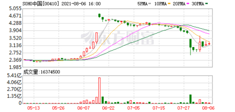 截至8月6日收盘,港股上市的SOHO中国收于3.22港元,市值167亿港元。