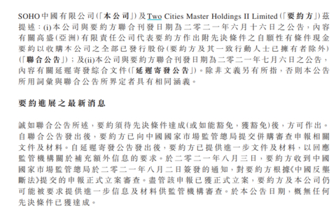 2021年8月3日,要约方收到中国国家市场监管总局于2021年8月2日签发的通知,对要约方根据《中国反垄断法》提交的申报正式立案审查。尽管该申报已获正式立案,要约方及SOHO中国仍可能被要求提供进一步信息及材料供监管机构审查。截至目前,没有任何先决条件已获达成。