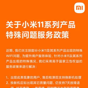 8月6日下午,小米公司官方微博@小米服务那些事 发布公告称,关注到部分小米11及其系列产品出现的特殊WiFi问题。针对小米11及其系列产品出现的特殊情况,小米称将采用高于国家三包权益的服务政策来进行解决:出现此类现象的用户,售后检测后支持换新机处理。若换机后再次出现同样WiFi问题的用户,可以进行退机或再次换机。