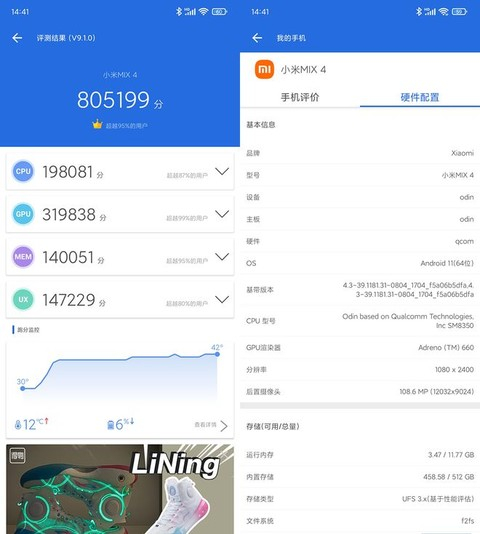 此外,在存储方面则是跟小米11 Ultra一样,沿用6400MHz LPDDR5运存以及UFS 3.1闪存。为了进一步验证性能表现,我们也用安兔兔进行实际跑分实测。最终80.5万分的成绩似乎跟此前搭载骁龙888的小米11系列差别并不大。