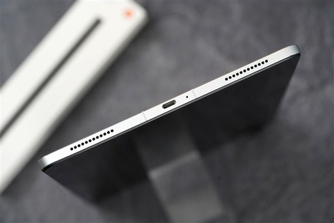 平板底侧边框仍有两个扬声器,与顶部扬声器组成四扬声器环绕系统,而且支持杜比环绕音。Type-C接口位于底侧边框中央,右边则是一个降噪孔。
