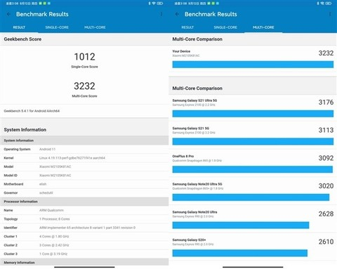 在Geekbench跑分中,小米平板5 Pro搭载的骁龙870的单核得分为1012分,多核得分为3232分,超越搭载Exynos2100的三星S21Ultra5G。