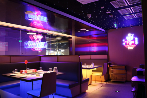 “Hi捞小酒馆”位置与火锅就餐区有分隔,有单独一片区域,通过装饰和设计,营造了酒吧的氛围感。