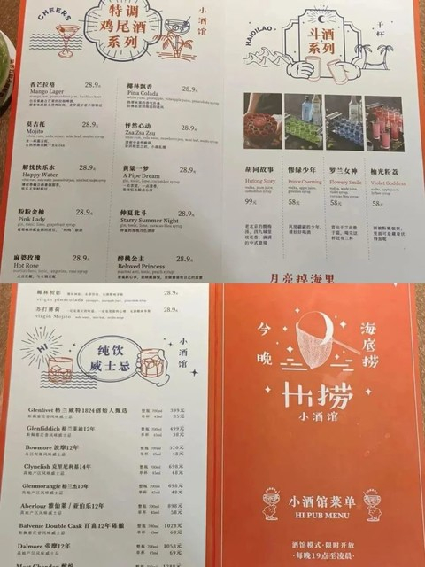 小酒馆酒水十分丰富,分为6类:仲夏北斗、怦然心动、香芒拉格在内的特调鸡尾酒;正阳门下、罗兰女神、柚光粉荔在内的斗酒系列;无酒精系列有苏打薄荷、椰林树影等;纯饮威士忌有格兰威特、波摩、格兰杰等;海底捞自有品牌的啤酒等。