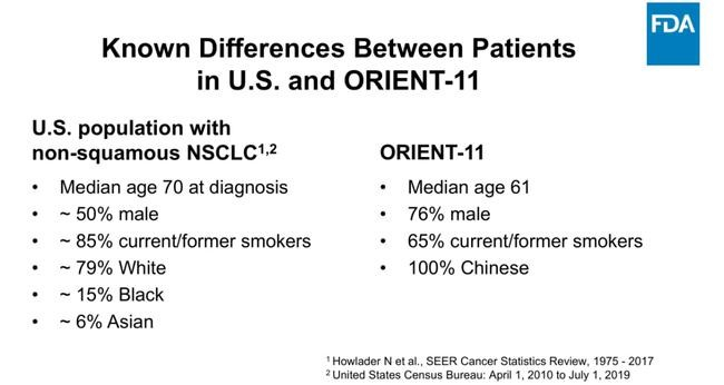 根据官方文件,FDA强调临床试验的多样性和代表性。信达生物申请药品的临床患者,76%为男性,65%为有过吸烟史,中值年龄为61岁;而美国同类药品的试验人群,50%为男性,85%为有过吸烟史,中值年龄为70岁。