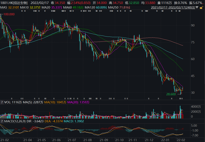 从二级市场表现来看,信达生物股价自去年11月下旬一路下行,2022年2月14日跌至近一年低点28.6港元/股,截至2月18日,其收于34.05港元/股,今年以来下跌28.8%,市盈率(TTM)为负值,总市值为499亿元。