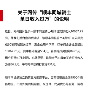 顺丰同城骑手日入过万? 官方回应:用户打赏7856元
