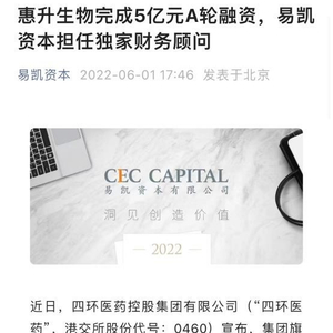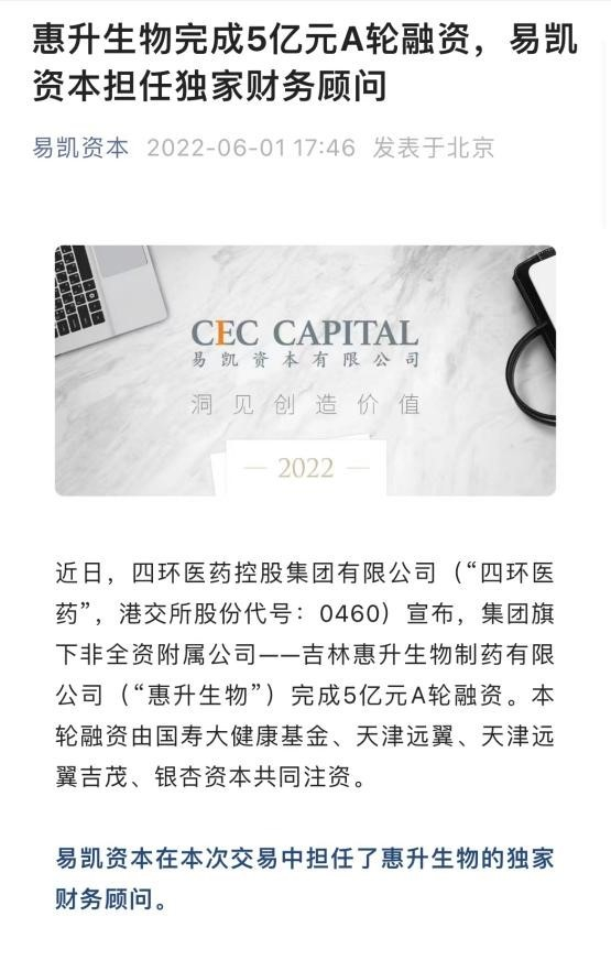 6月1日,港交所上市公司四环医药宣布,集团旗下非全资附属公司——吉林惠升生物制药有限公司(以下简称惠升生物)完成5亿元A轮融资,由国寿大健康基金、天津远翼、天津远翼吉茂、银杏资本共同注资。