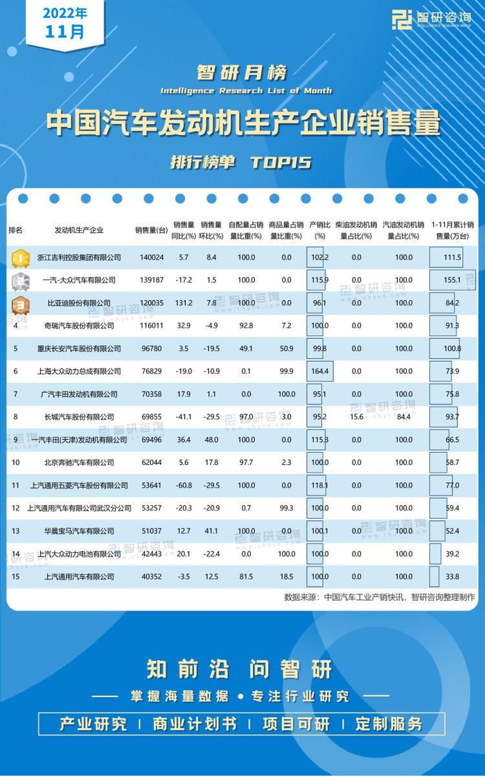 2022年11月中国汽车发动机生产企业销售量排行榜:附月榜TOP15详单