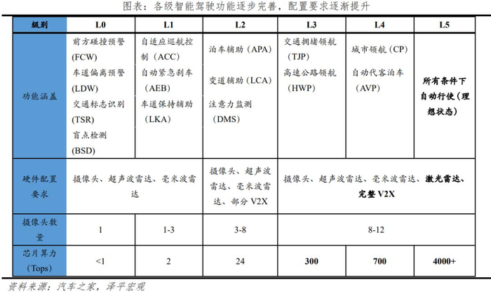 自动驾驶技术涉及交通、通信、电子等多领域融合和多产业协同,是一个从L0、L1、L2往L3、L4、L5渐进的过程。随着等级上升,软硬件配置要求也在提高。以激光雷达为例,L0-L2驾驶辅助无需激光雷达,但在L3及以上高阶自动驾驶中,激光雷达是必不可少的硬件设备。芯片方面,若要实现L2到L3级别的跨越,算力需要从24Tops跨越到300Tops,提升至少12.5倍。