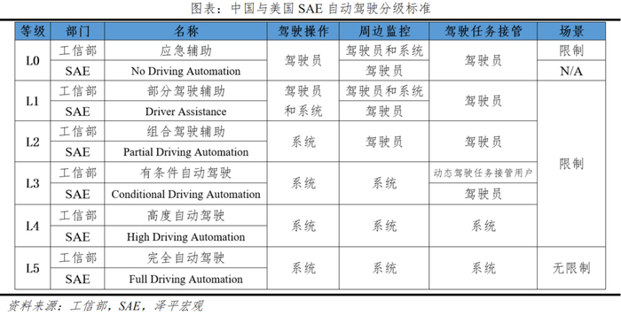 智能驾驶可划分不同等级。我国《汽车驾驶自动化分级》规定智能驾驶分为6个等级:L0-L2为驾驶辅助,L3-L5为自动驾驶。通俗来讲:L1一般是可以解放手或者脚;L2可以同时解放手和脚;L3可以进一步解放眼;L4及以上还可以解放大脑。