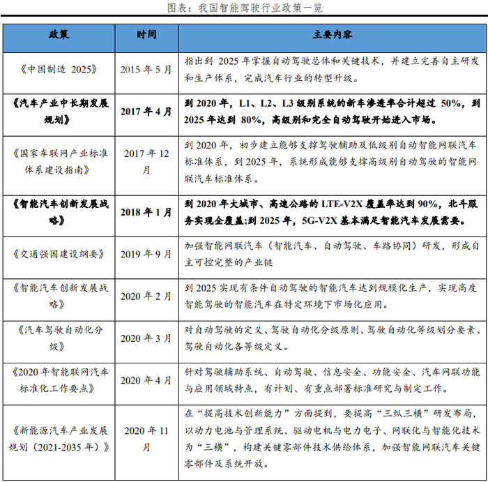 2015年,《中国制造2025》的发布是我国自动驾驶政策起步的关键,也标志着我国开始对自动驾驶产业进行总体方向规划。2017年的《汽车产业中长期发展规划》是第一部分类自动驾驶级别、对市场提出规划的文件,并在同年提出了完善相关标准的指南。2018年《智能汽车创新发展战略》具体指出发展自动驾驶所需要的V2X技术要求。