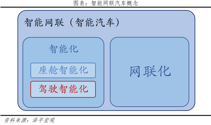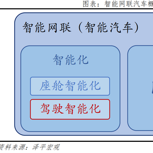 汽车新四化包括:电动化、智能化、网联化、共享化,智能驾驶就是聚焦“智能化”、“网联化”两大属性。智能化,又可细分成驾驶智能化和座舱智能化,驾驶智能化就是自动驾驶。