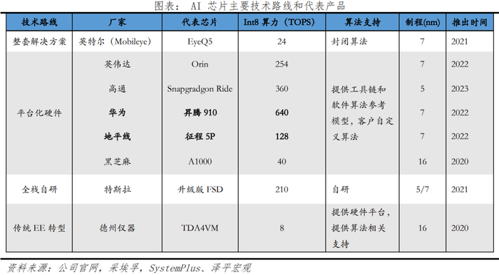 AI 芯片主要有四种算法支持技术路线:封闭算法、提供工具链、自研、提供硬件平台,长期来看全栈自研和平台化硬件可能是较优路径。全球第一梯队厂商有英特尔、英伟达等,国内芯片厂商也逐步具备智能驾驶辅助芯片自给能力。从高阶自动驾驶能力来看,目前拥有200TOPS以上算力AI芯片的厂商有英伟达、英特尔、高通、华为等少数几家。华为昇腾910在2022年8月正式推出,算力达到640Tops。国内其他芯片厂商如地平线、黑芝麻等企业也在陆续发力。