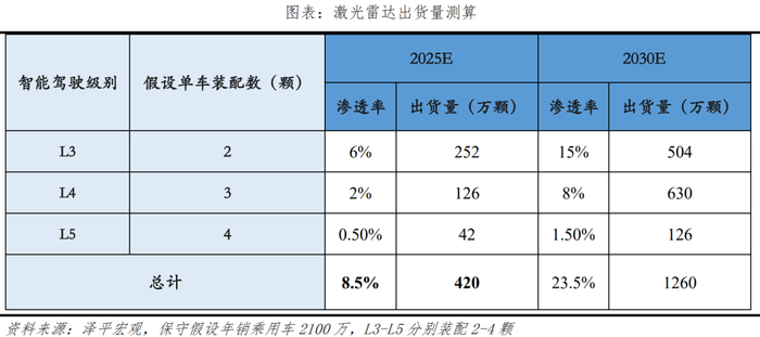 智能驾驶要求软硬件升级, L3及以上配备激光雷达是行业共识,拉高了单车成本。此前激光雷达单颗售价高昂,例如,激光雷达鼻祖Velodyne在2020年发售的单颗价格约3999美元。近年来,单颗售价呈现逐步走低、平价化趋势,欧洲激光雷达龙头法雷奥,其主流产品Scala2的单价在1000美元左右,小鹏P系列装配览沃科技国产激光雷达,单价约9000元。未来,预计到2025年能实现420万颗量级左右的激光雷达出货,单价下降到200-300美元左右,让消费者能更加接受,这也是激光雷达大规模装车落地的关键。