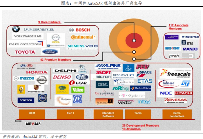 中层是中间件,是解决不同供应商软硬件兼容性问题的核心,也是域控制器产品中技术壁垒最高的环节。通过集成的AutoSAR汽车开发系统架构,连接上层应用软件和底层操作系统,实现交互。中间件的开发需要投入极高的时间、人力和财务成本,此外,还需要与多家供应商长时间合作来进行产品兼容性调试与匹配。中间件准入门槛高,AutoSAR框架从2003年建立至今,联盟包含近200家企业,只有9家核心企业和63家一级会员能实际参与到开发模式的筹划、管理和调控。我国有百度、华为、经纬恒润、国汽智控等8家是一级会员,完成中间件的自主替代是长期较为艰巨的任务。