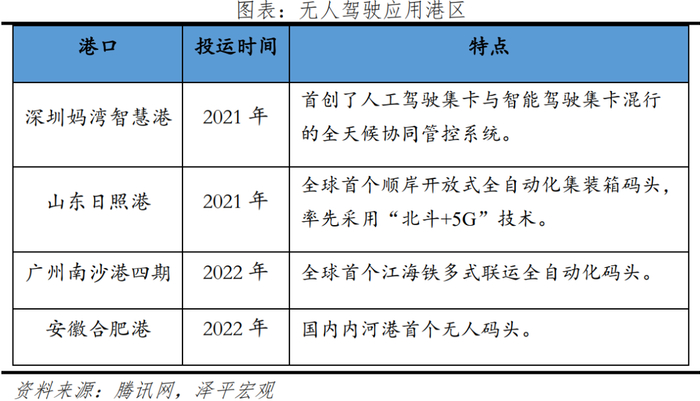 商用方面,主要是将具备无人驾驶条件的作业型和运输型专用车辆在限定的工业、商业区域应用。无人码头运输对交通运输业和物流产业影响深远。无人码头运输能提高运货精准度,帮助港口提升作业效率,缓解港口压力的同时还降低了运营成本,可以极大减少码头安全事故。天津、厦门、宁波、青岛等多城市港口都升级采用了无人驾驶集装箱卡车,深圳妈湾智慧港、山东日照港、广州南沙港四期、安徽合肥港都有智能化无人港区陆续建成。粤港澳大湾区的广州港南沙港区自动化码头,集成了无人驾驶、5G通讯、北斗导航等多项先进智能技术的应用,是全球首个江海铁多式联运全自动化码头,未来推广应用空间巨大。高速无人重卡的应用和无人码头类似,只不过场景从封闭式的港口区域变成了高速公路。公路干线物流运输的痛点之一是物流成本,而无人重卡的应用可以显著地实现降本增效。目前对高速无人重卡发展的担忧还是道路安全隐患,为此,需要在高速路中间设置自动驾驶干线物流专线,一旦出现车辆问题,能紧急停靠,避让行车。我国矿区无人重卡的应用走在世界前列。早在2018年,国家能源集团的露天煤矿用自卸车无人驾驶系统立项。2022年,我国自主的930E矿用卡车在内蒙古投入使用,是全球最大无人驾驶矿用卡车。实现“装、运、卸、配合”作业流程完全无人,自主操作。矿区无人卡车因为在封闭区域内作业,风险因素相对更容易控制,大规模商用未来可期。