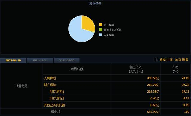 从营收结构来看,2022年上半年,这家公司的人身保险收入490.58亿元,占营收的70.69%;财产保险收入202.78亿元,占营收的29.22%。