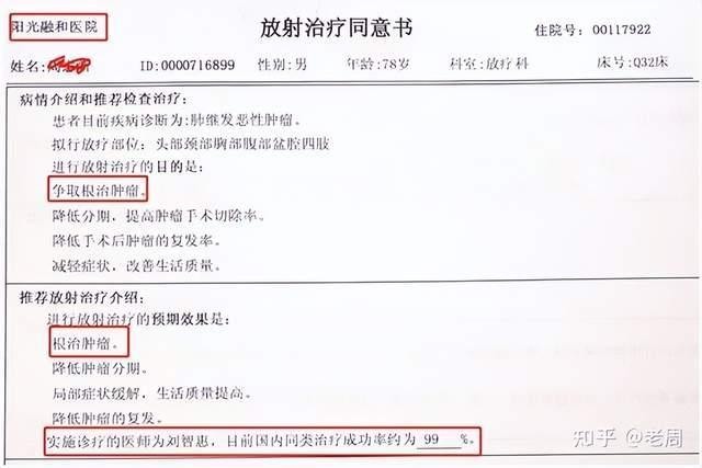 这位患者的父亲是口腔癌转移肺癌,属于肺广泛转移者,CT可见病灶多达十几个。受人推荐后,到阳光融合医院就诊,院方给出的治疗方案是放射治疗,并且给出的预期效果是根治肿瘤,还给出患者同类治疗成功率为99%。