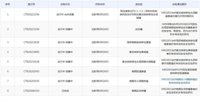 公司MRG003晚期非小细胞肺癌、晚期胆道腺癌、复发转移性鼻咽癌、局部晚期/转移性胃癌等多个适应症均已进展到II期(复发转移性鼻咽癌已于今年1月份获得IIb期临床研究批准),末线/复发性头颈鳞癌项目(中美双报)可能会在未来2个月内实现III期入组。
