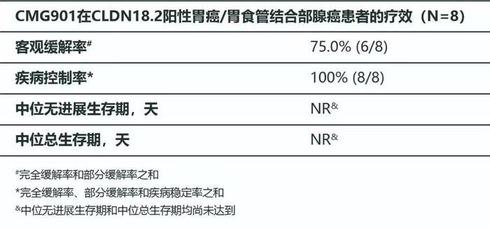 乐普生物与康诺亚共同开发的Claudin 18.2 ADC药物CMG901胃癌/胃食管结合部腺癌适应症于2022年4月获得FDA快速通道及孤儿药资格,又于2022年9月获得CDE突破性治疗认定,研发进度居前。2023 ASCO壁报数据显示,8例Claudin 18.2阳性胃癌/胃食管结合部腺癌患者中,客观缓解率为75%,疾病控制率100%,中位无进展生存时间、中位总生存时间尚未达到,安全性良好。