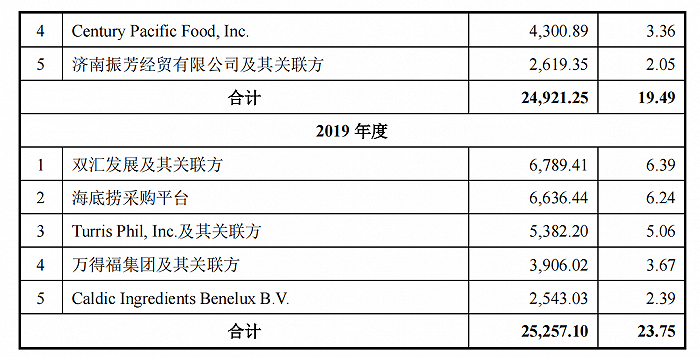 招股书显示,报告期内(2019年-2022年1-6月)公司直销给海底捞的销售额分别为6636.44万元、5208.30万元、8938.02万元、5510.64万元;直销给鲁花(2021年-2022年1-6月)的销售额分别为5468.97万元、2066.78万元。