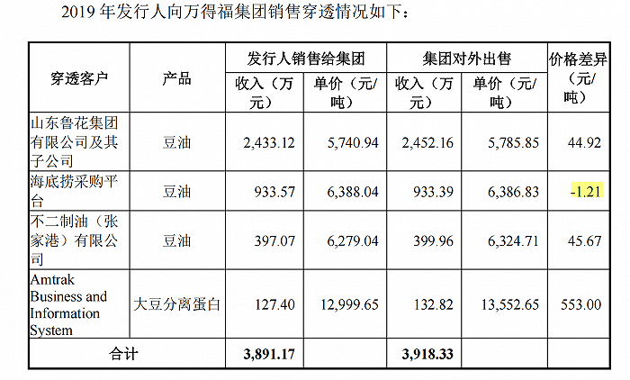 界面新闻注意到,公司报告期向海底捞、鲁花销售豆油的同时又通过万得福集团向上述公司销售同一产品,且销售价格存在差异。