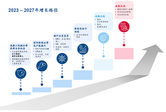 海外并购方面,今年公司也在积极持续推进,计划分为三个路径。第一,利用HRC在美国的龙头地位,完善试管婴儿业务产业链。在疫情最困难的时候,HRC与美国南加州大学医学中心签署合作协议、在尔湾升级了诊所等。在疫情放开后,HRC更要巩固在美国以及全球的影响力。第二,我们也在东南亚这一人口密集、经济增长较快、人口增长较为明确的区域积极寻找优质标的。我们认为,东南亚市场未来也会诞生一个像HRC这一体量且具有影响力的试管婴儿中心,因此东南亚会成为我们今明两年的并购重点区域。第三,我们也在积极研究、探索布局中东市场机会。目前国际政治经济形势下,中东有可能是未来中西方的缓冲区域,公司已经着手加强对这一区域的深入调研。