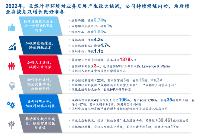 基于强大管理团队支持,锦欣生殖踔厉奋发、勇毅前行。2022年,面对外部环境所带来的挑战,团队勤修内功蓄力打响疫后复苏的每一战。在医疗质量方面,公司持续提升成功率,为患者提供更好的服务体验;在成本端控制方面,公司从供应链等方面为抓手强化成本管理,剔除并购重组所带来的影响,公司实现了真正的降本增效,从源头提升公司未来持续盈利能力;在员工可持续性教育层面,公司以锦欣学苑为平台,推出生殖专科课程对员工进行全方位培训;在学术科研方面,公司旗下院区获得多个项目立项,包括成都和深圳地区在内的四家院区累计发表学术论文突破100篇;在数字化转型方面,过去一年公司实现了所有医院的信息化系统打通,为未来构建一站式生育服务打下基础。