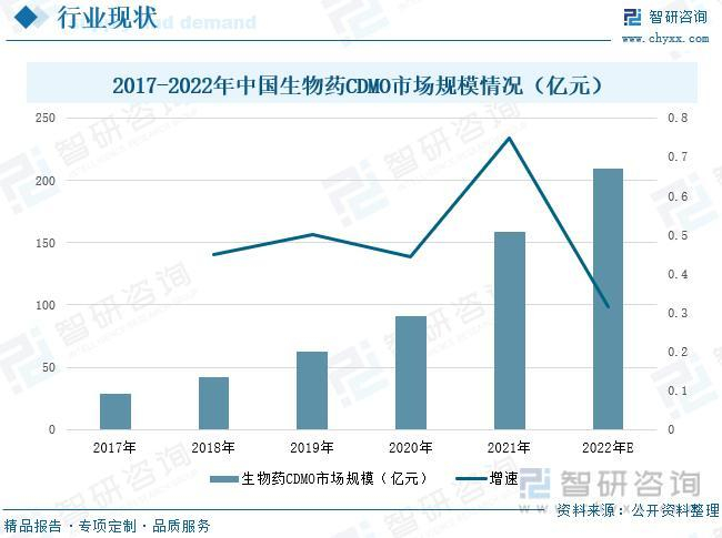 生物药凭借卓越的疗效,在生物科技的高速发展以及研发投入增加等因素下,以抗体为代表的一系列生物制品近些年来以及逐渐成为全球医药产业的发展重心。随着越来越多的药企愿意将其业务外包,意味着生物药CDMO市场规模不断扩大,2017年至2021年,生物药CDMO市场规模不断增长,从2017年的29亿元增加到2021年159亿元,预计2022年生物药CDMO市场规模达到209亿元,较2021年同比上升31.45%。