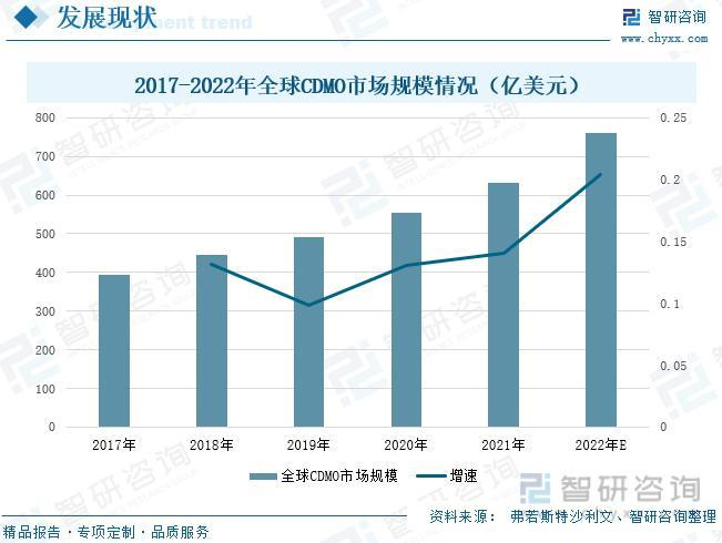 近年来,全球CDMO市场规模快速增长,2017年至2021年,全球CDMO市场规模从394亿美元增长至632亿美元,年复合增长率达到12.5%,预计2022年全球CDMO市场规模保持上升趋势,达到761亿美元。