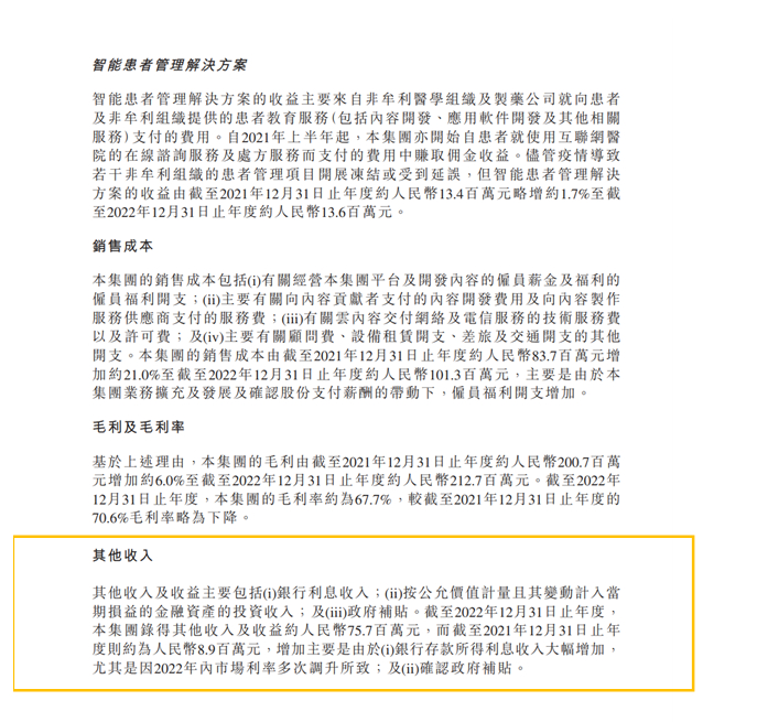 医脉通2022年度业绩公告第13页中有披露,净利润的增长主要来自于“其他收入”,其中政府补贴及银行存款利息7,570万元,同比增长750.6%,2021年同期只有890万元。