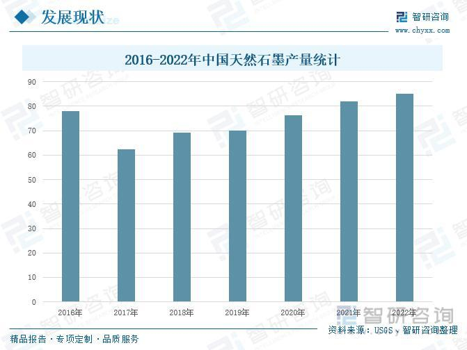 我国是一个石墨资源储存大国,也是石墨产量大国。我国石墨矿产资源的开发大致可以分为三个阶段,第一阶段为2012年以前,我国对于石墨资源的开采强度高,石墨采选以中小型企业为主,生产规模小而分散,技术设备落后,导致长期过度消耗的石墨资源;第二阶段为2012-2016年,工业和信息化部提出《石墨行业准入条件》, 开始遏制石墨开采低水平重复建设,对石墨项目建设、生产规模、产品质量进行规划,改变多、小、散、乱的市场格局,我国石墨开采进入整顿时期;第三阶段为2016年以后,2016年11月,国务院批复同意由国土资源部等六部门共同发布实施《全国矿产资源规划(2016—2020年)》,将石墨列入战略性矿产资源目录,进一步加强对石墨资源的开采利用管理。据USGS,2016-2022年,我国天然石墨产量呈先下降后上升的趋势,其中2106-2022年,我国天然石墨产量连续五年实现同比增长,2022年,我国天然石墨产量为85万吨,同比增长3.66%,主要系新能源、新材料、信息技术以及核电领域对于石墨的市场需求增长所致。