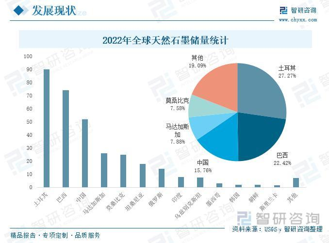 根据美国地质局数据统计,2022年,全球石墨储量总计3.3亿吨左右,其中土耳其、巴西和中国地区的天然石墨储量较为丰富,分别为9000万吨、7400万吨和5200万吨,其占全球天然石墨储量比重分别为27.27%、22.42%和15.76%,三个地区的天然石墨储量合计约2.16亿吨,占全球天然石墨储量65.45%左右,全球天然石墨储量分布高度集中。此外,在马达加斯加、莫桑比克、纳米比亚和坦桑尼亚发现了大型石墨矿,斯里兰卡盛产高品位的致密块状石墨,马达加斯加盛产大鳞片石墨,印度、朝鲜、墨西哥则拥有丰富的隐晶质石墨。