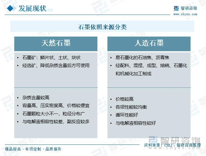 石墨按照来源可以分为天然石墨和人造石墨两类,天然石墨主要来自于石墨矿,根据形状不同可以分为鳞片状、土状和块状;而人造石墨通过易石墨化的石油焦和沥青焦加工制成,根据内部晶体取向可分单晶石墨和多晶石墨,根据制造方法不同又可分为热解石墨、高定向热解石墨、石墨纤维等。天然石墨和人造石墨为目前我国主要的电池负极材料,由于人造石墨的各项性能均衡,且循环寿命长好,与电解液相容性较好,所以天然石墨在锂离子电池负极材料中的占比呈现下降的趋势,而人造石墨在锂离子电池负极材料中的占比呈现上升的趋势。