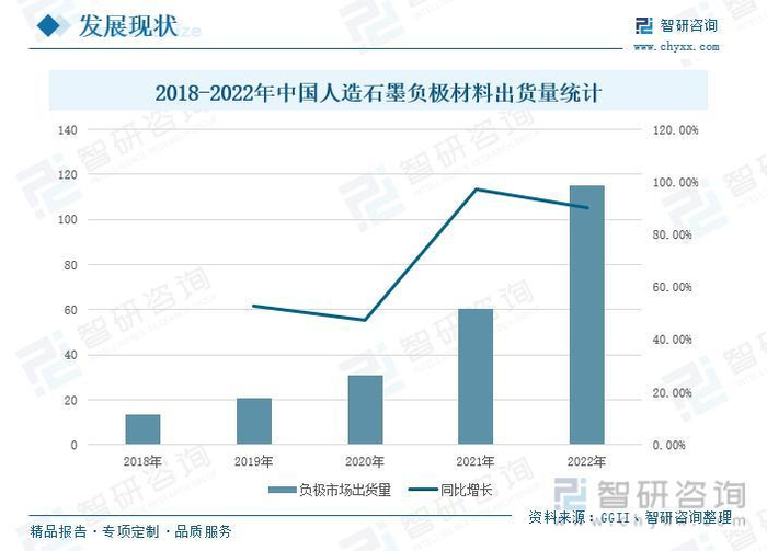 人造石墨负极材料综合性能较为突出,相较于天然石墨负极材料更受市场欢迎。根据GGII统计,2018-2022年我国天然石墨出货量连年增长,2018-2022年我国天然石墨负极材料出货量分别为13.6万吨、20.8万吨、30.7万吨、60.5万吨和115.08万吨,2019-2022年分别同比增长52.94%、47.60%、97.07%和90.21%。2022年我国人造石墨出货量占比约为84%,人造石墨的出货量高增的主要原因为新能源汽车对于续航要求提高,人造石墨的能量密度相对于天然石墨更高,且循环性能、安全性能相对占优,主要应用于动力电池市场和高端消费市场。受益于新能源汽车需求带来的动力电池产量增长,人造石墨保持较高增长速度,未来一段时间内仍将保持增长态势。