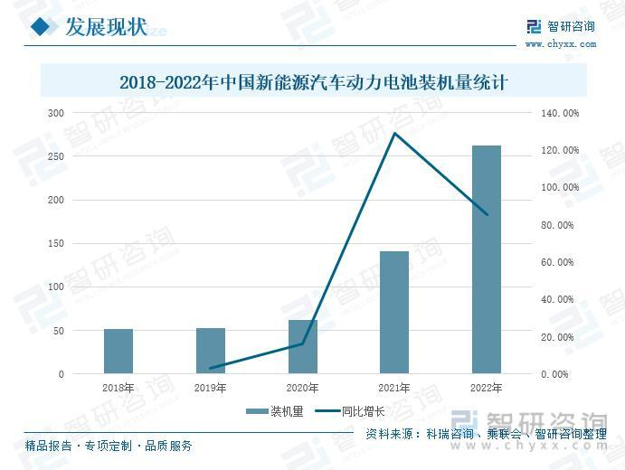 随着我国“碳中和、碳达峰”战略目标的推进,我国新能源汽车行业发展十分迅速,其电气化、智能化等发展趋势加快了动力电池行业的发展。根据科瑞咨询相关统计,2018-2022年,我国新能源汽车的动力电池装机量连年增长,2021年,我国新能源汽车动力电池的装机量为141.4GWh,同比增长129.17%;2022年,我国新能源汽车动力电池的装机量为261.8GWh,同比增长85.15%。2021-2022年,国家出台了一系列支持新能源汽车发展的政策,推动我国新能源汽车的发展,新能源汽车的产销量和市场占有率得到大幅增长,促进动力电池装机量持续上升,拉动石墨产品市场需求快速增长。