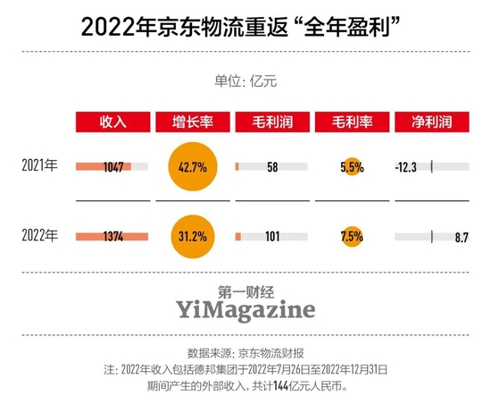 更重要的是,德邦虽遭遇传统零担业务转型不利的危机,但仍具备很强的盈利能力。4月20日,德邦公布并入京东物流后的首份年报:2022年公司实现净利润6.49亿元,同比增长339.08%,扣除非经营性损益后净利润达3.13亿元。京东物流去年之所以重返全年盈利,很大程度上是受益于德邦“并表”。