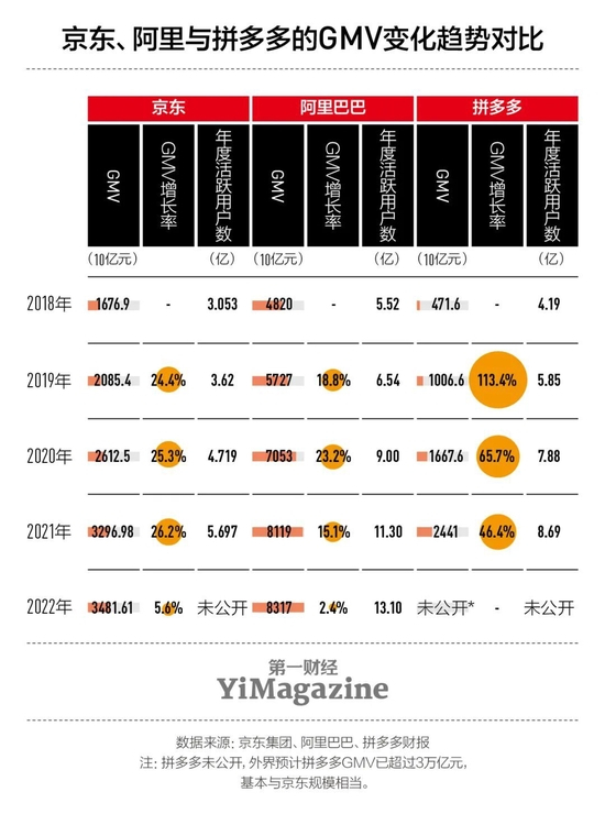 财报显示,京东集团2022年全年实现营收10462亿元,同比增长9.9%;GMV为34820亿元,同比增长5.6%。而此前4年,京东这两项指标几乎一直保持着同比25%以上的高速增长。