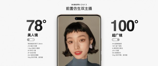 小米Civi 3带来了小米Civi系列史上规模最大的一次影像升级,前置「仿生双眸」,由一枚78°「美人镜」和一枚100°「超广镜」组成。